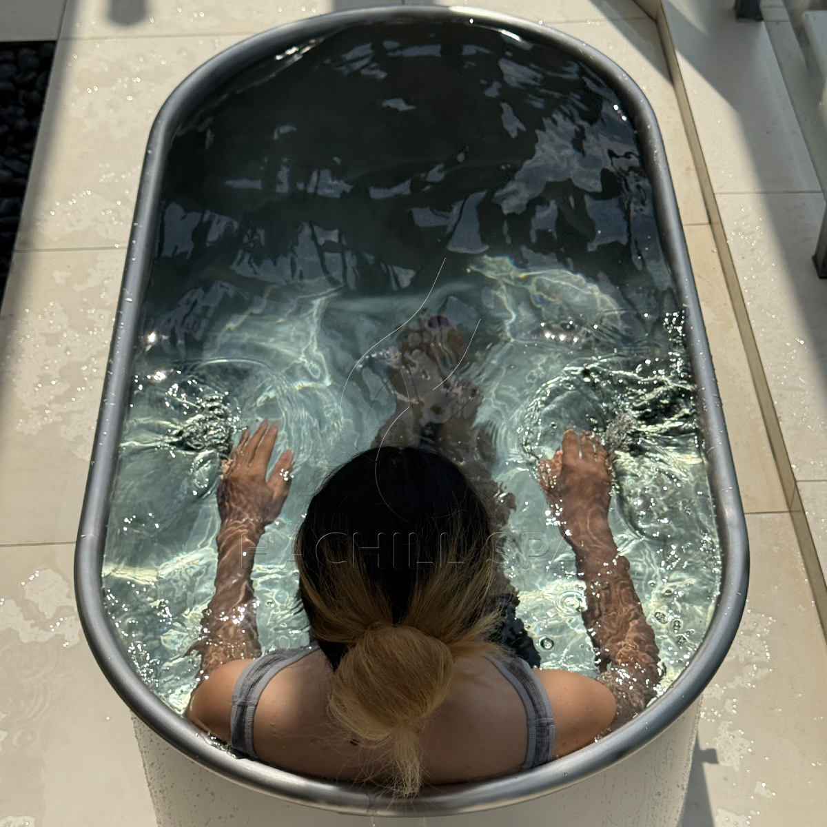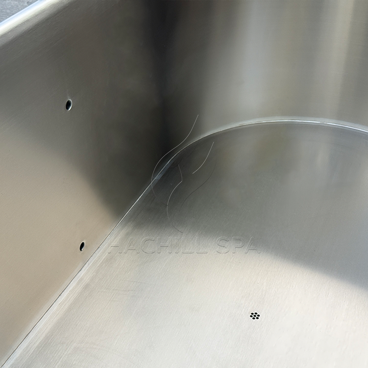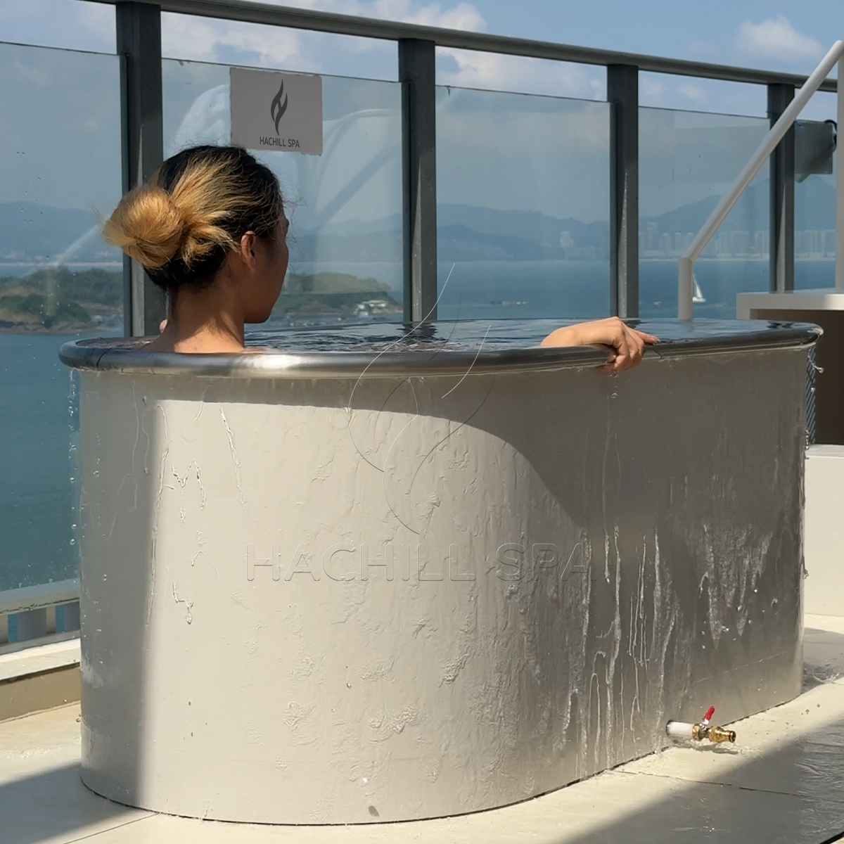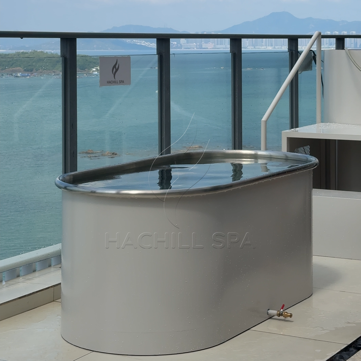 CT13 is crafted from a single layer of 304 stainless steel, finished in a clean white outdoor coating. Its rounded rim doubles as a comfortable handrest, creating a perfect balance of form and function for a refined cold plunge experience.