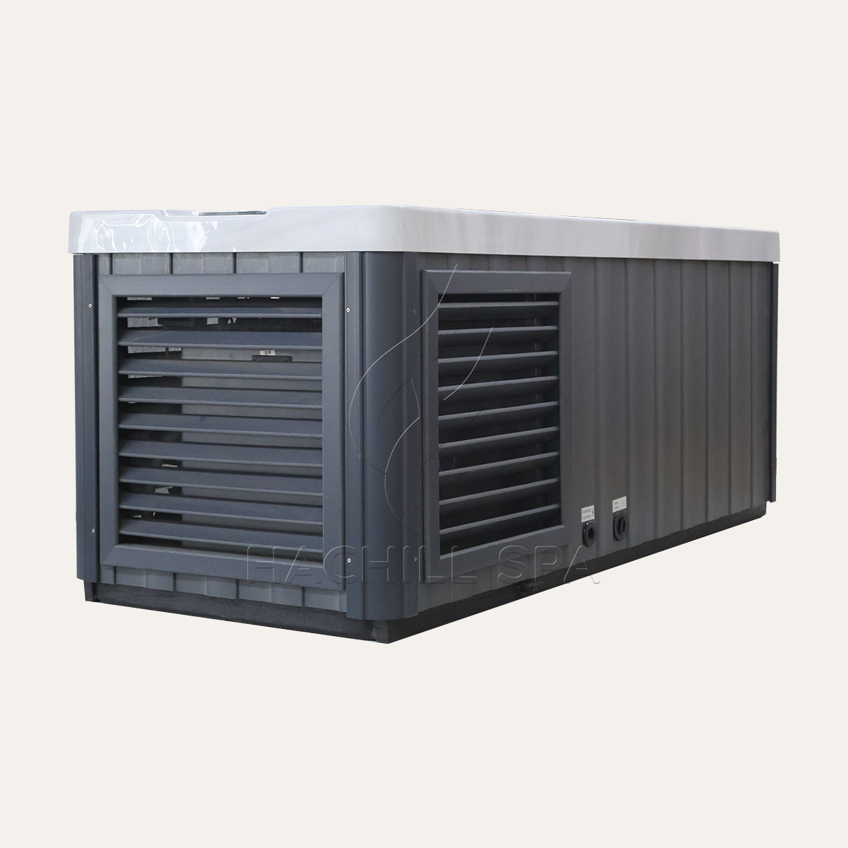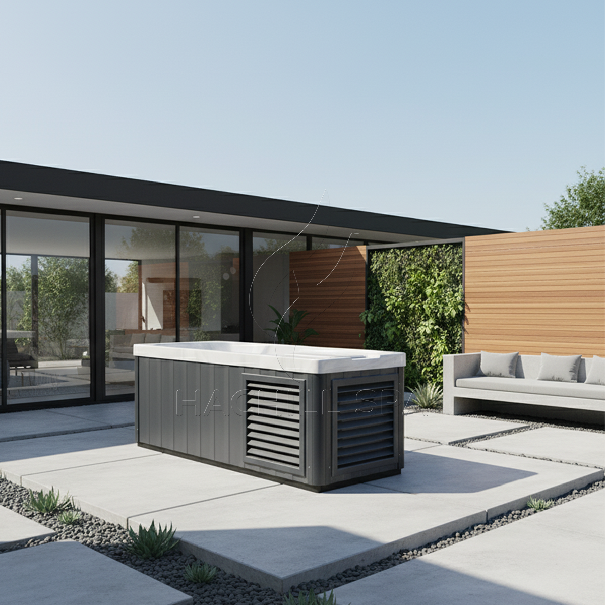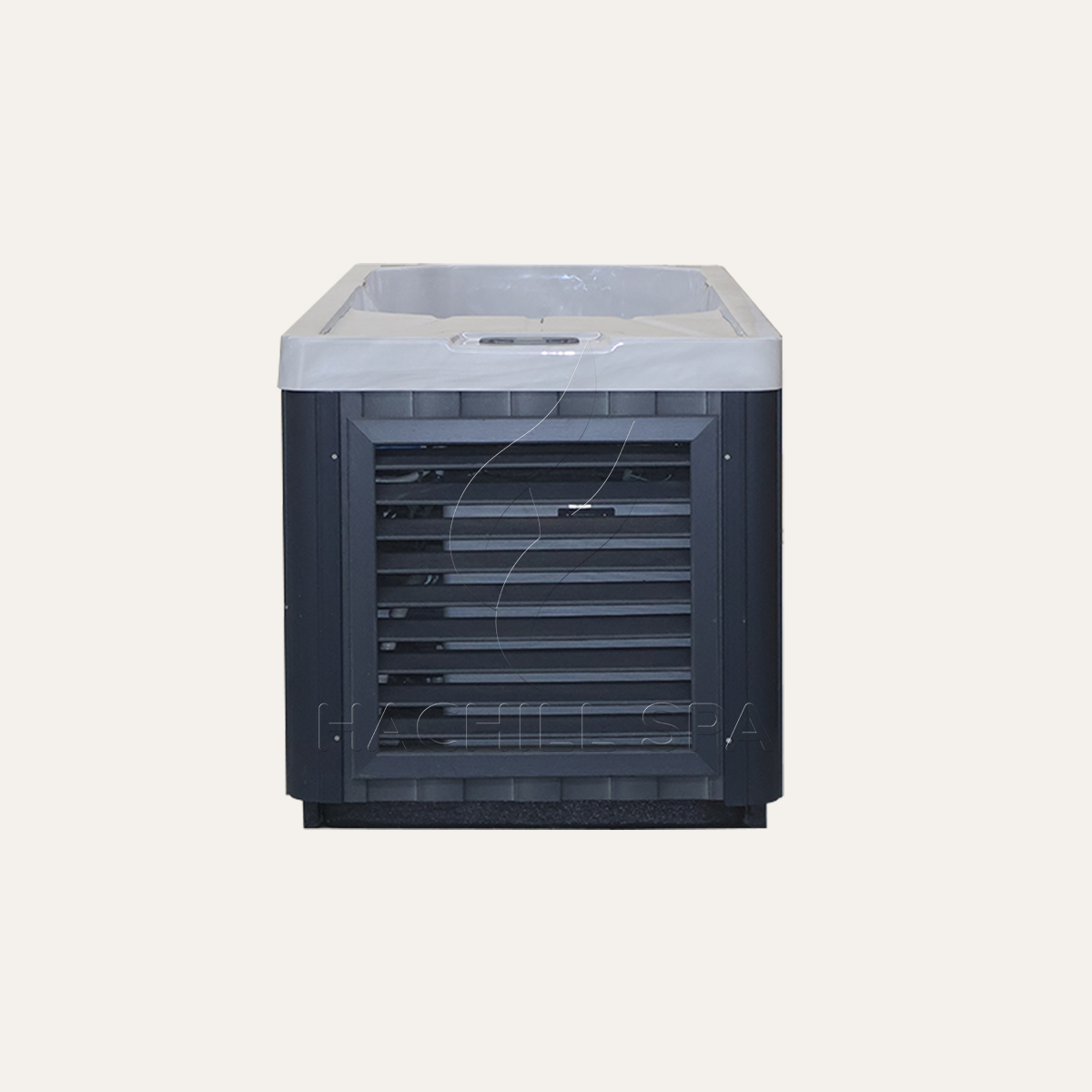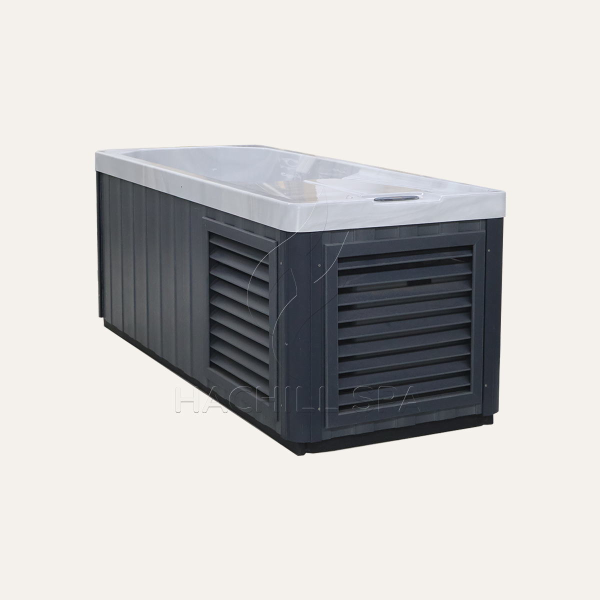 Modern, minimal, and built to last — the gray-blue WPC exterior and sleek acrylic interior create a clean, contemporary look that fits seamlessly into any spa, gym, or backyard retreat.