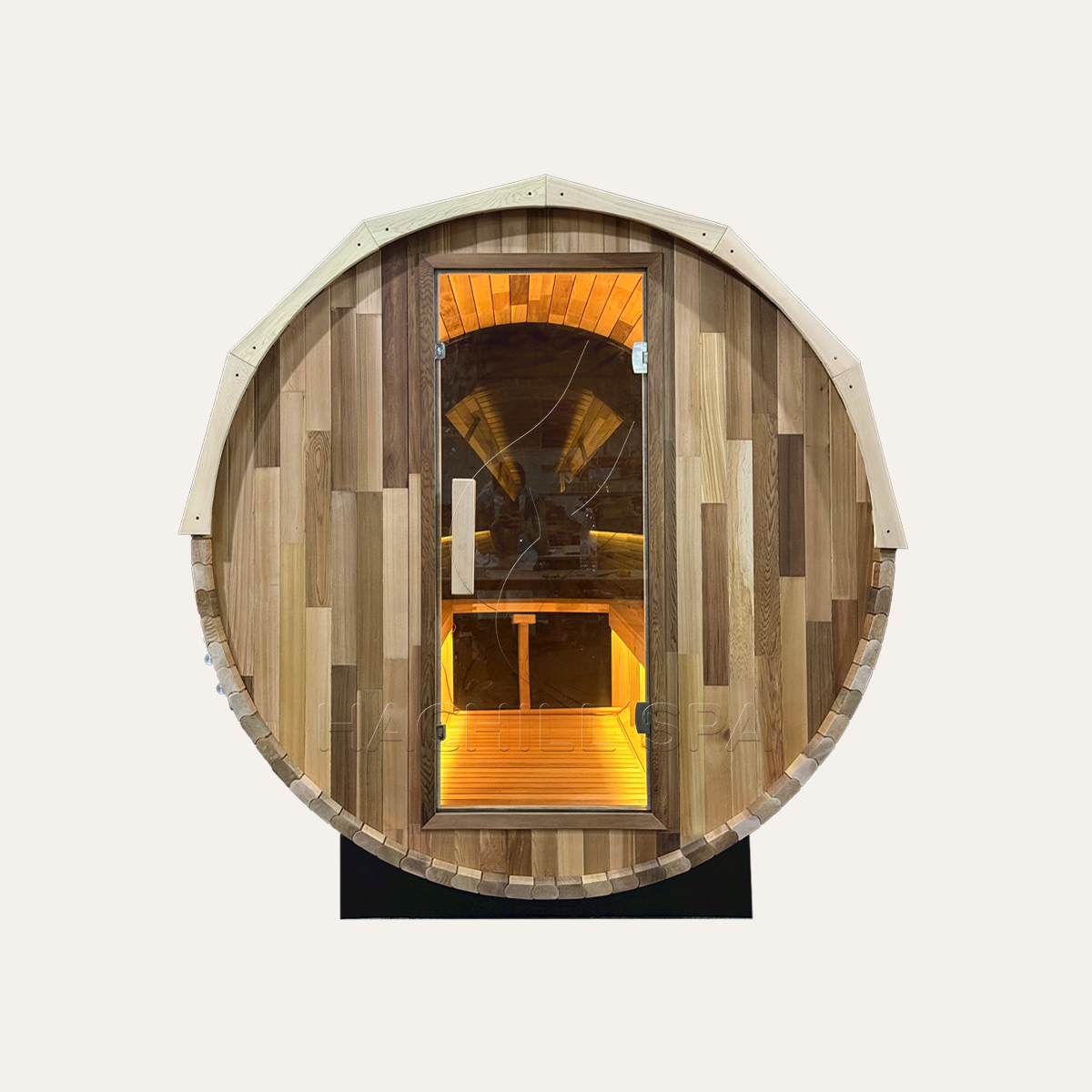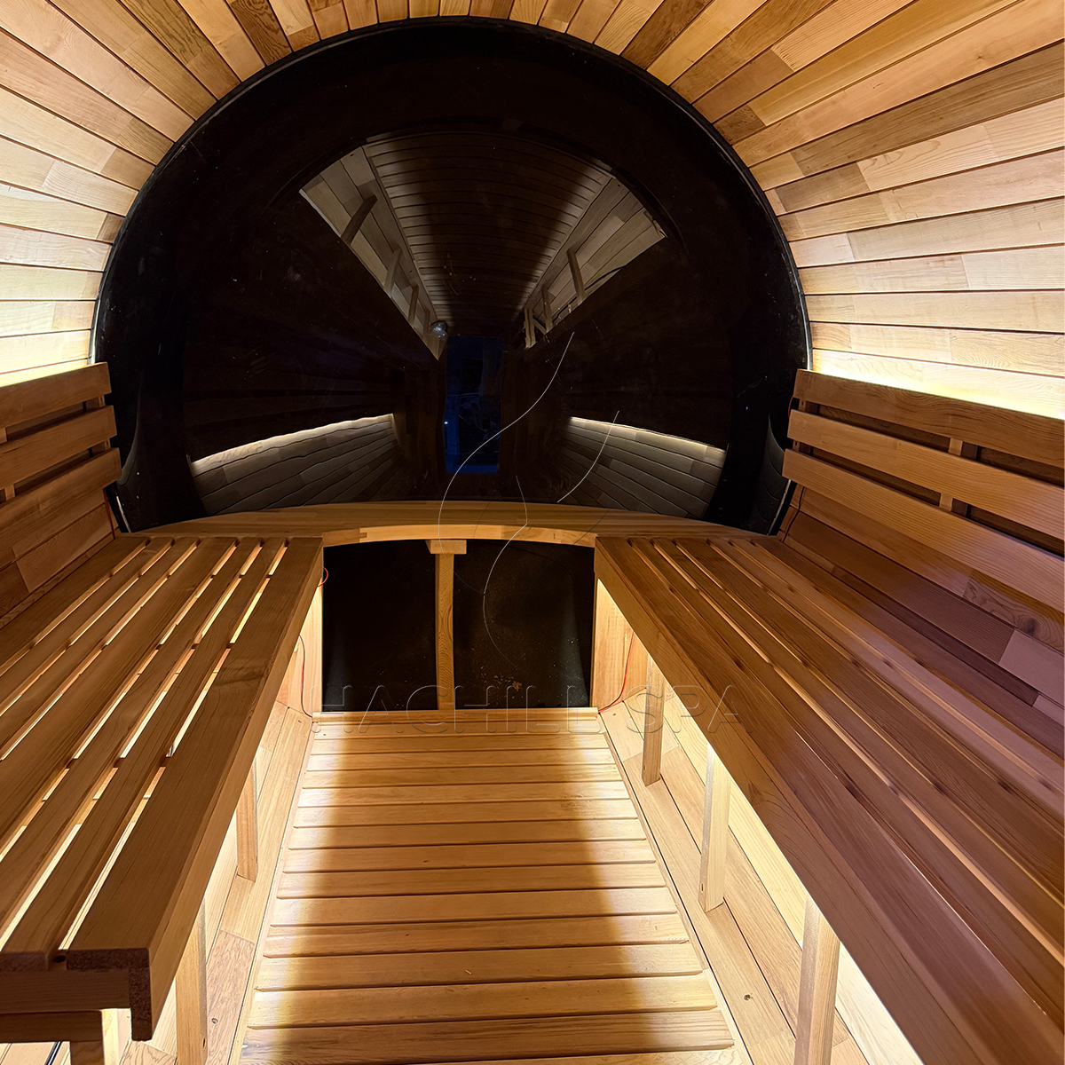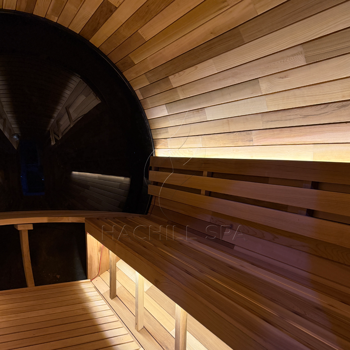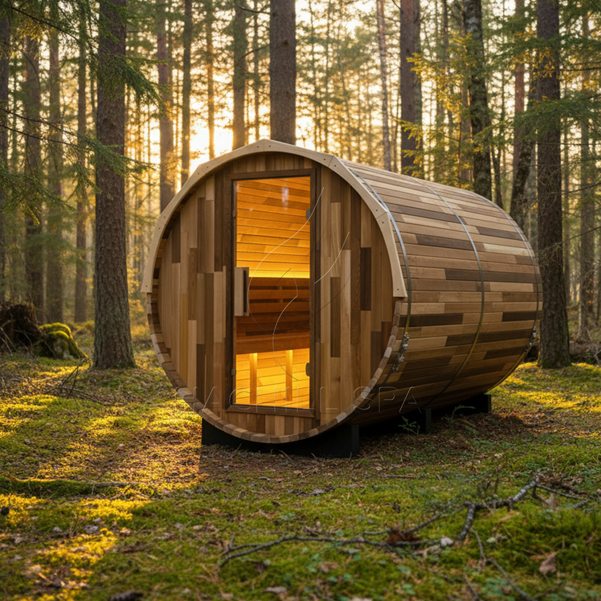 The HachillSpa Panorama View Outdoor Ø1800*L2400 Barrel Sauna combines traditional craftsmanship with modern engineering.